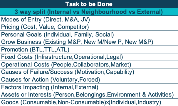 - Method of structuring - Split the tasks/activities into 3 categories (representing internal, neighbourhood and external)