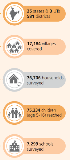The Annual Status of Education Report (ASER) is a citizen-led household survey that provides nationally representative estimates of children’s schooling status and their foundational reading and arithmetic skills. In its standard format, the survey reaches children in the age group of 3-16 in almost all rural districts of India. It is carried out each year by volunteers from partner organisations like colleges, universities, non-profit organisations, and teacher training institutes, among others.