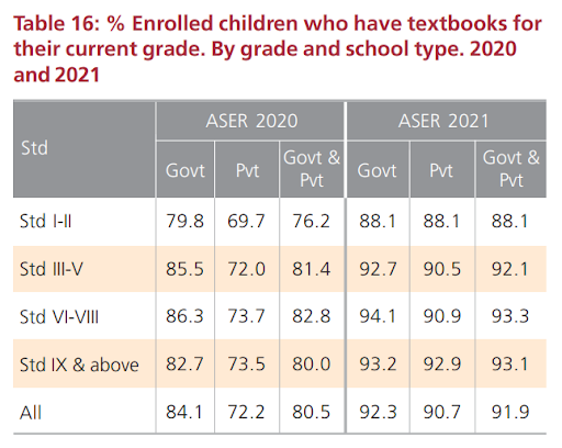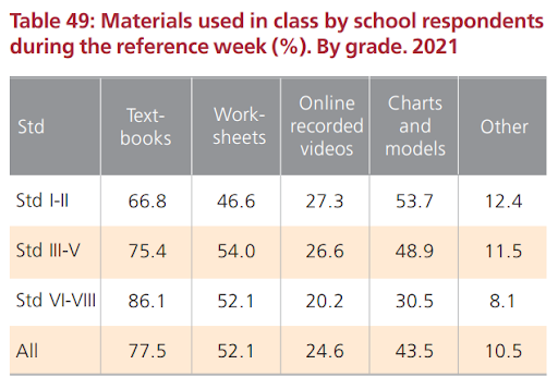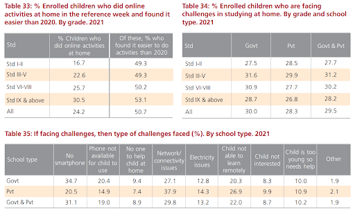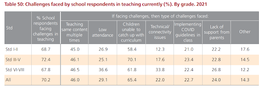 The pandemic years have a dampening effect on learning outcomes. Only ~70% of classrooms are able to cover the regular curriculum, with only ~40% including extracurricular activities, and ~50% having to revise the previous year’s curriculum. Further, some of the issues faced by teachers are in the table below.