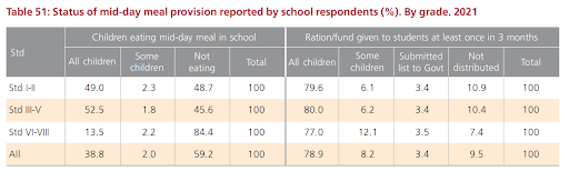 While adoption of the mid-day meal scheme is not very strong, providing funds/rations to school children seems to play a major role in rural education penetration.