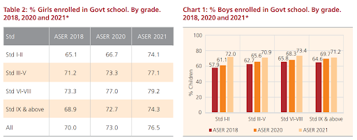 The percentage of children who are not enrolled in school went up in lower grades, but has dropped in higher grades. It is possible that many parents deferred enrolment of younger children till schools opened physically. The gender gap in enrolment has been nearly bridged. However, on the whole, the non enrolment rate has gone up to 5%.