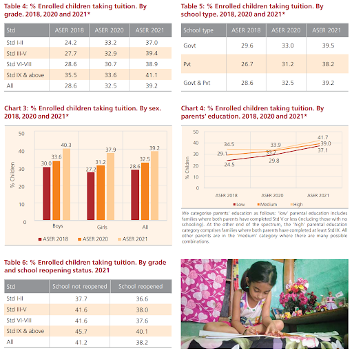 In the north east, and east, we see that government school enrolment rates have dropped, not increased. Alarmingly, private school enrolment rates haven’t gone up there, but rather this seems to derive from increased dropout rates. - By all metrics and cuts, the percentage of students attending tuitions are increasing.